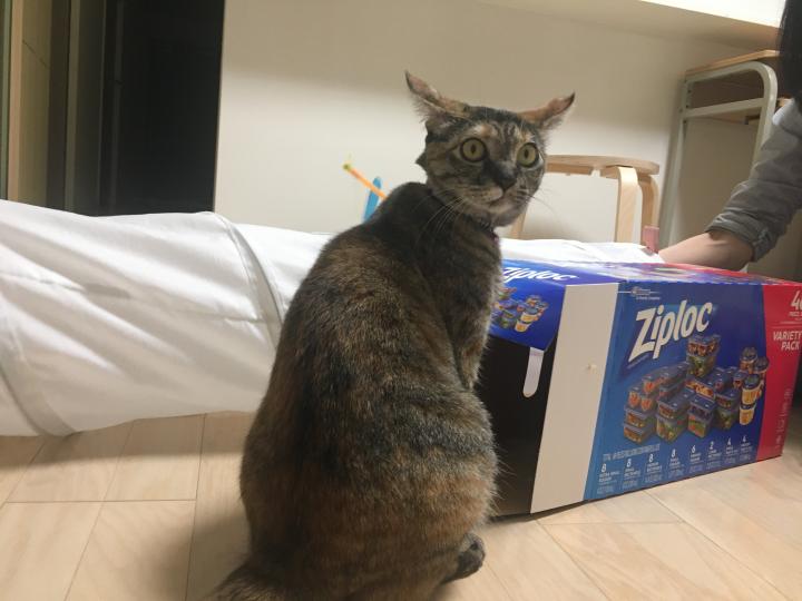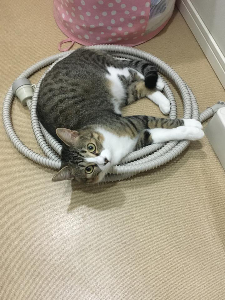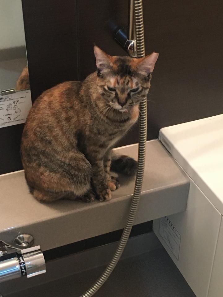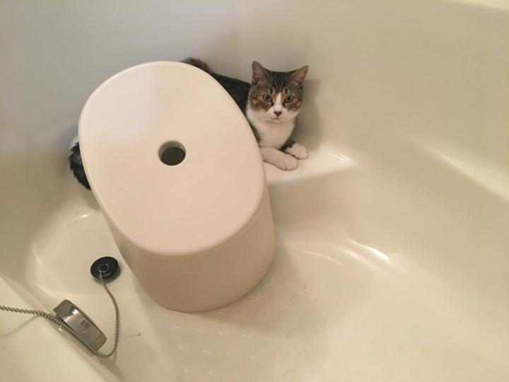 この数日の彼女たちのベスポジはお風呂場と洗面所。お湯を張っている時はNGだけど、お湯を抜いてる時の状態でお風呂イスの下にムギューっと身体を入れてのかくれんぼ。
