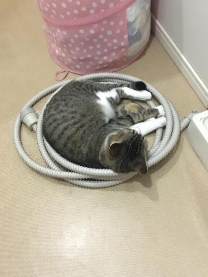 常にエアコンをかけているので、南側のリビングとネコ部屋も快適なはずなのですが、洗面所や北側の部屋が涼しいのか、コチラにいる確率が高くなってきています。最近解放したので、珍しいというのもあるかも。