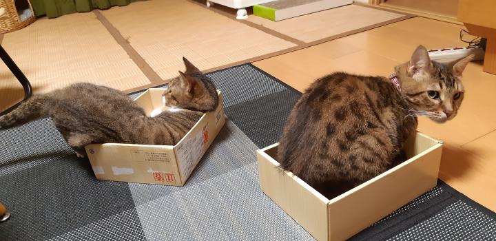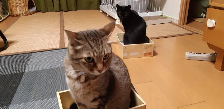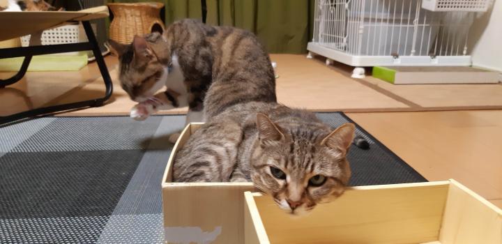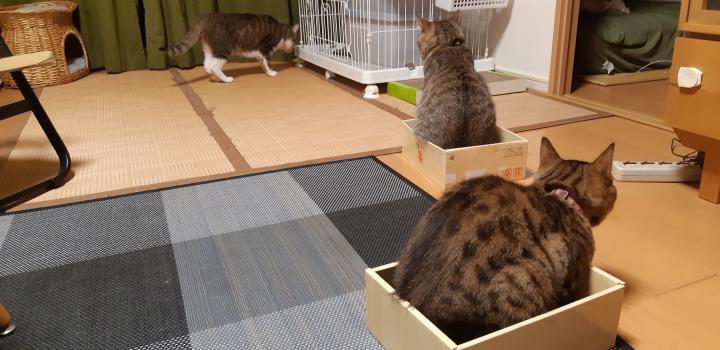 ちなみにこれ、箱が少しずつ動いてるのは、ニャンズが自分たちで動かしてます。