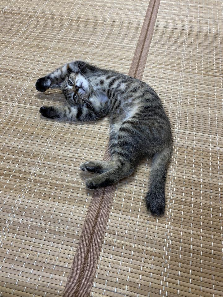毎日ころころたまにどたばたと遊び、のびのびお昼寝し、もりもり食べています。来た時によく潜っていたケージ下の隙間にはもう入れなくなるほど大きくなり、踏み台なしで90センチくらいある窓枠にも乗れるようになるほどジャンプ力もついてきました。