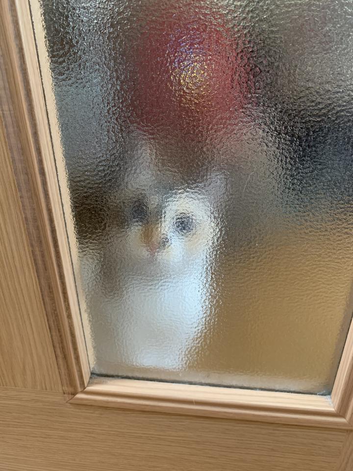 子猫の方に行きたくて仕方ない様子ではありますが、ガラスの向こうで我慢してもらっております。