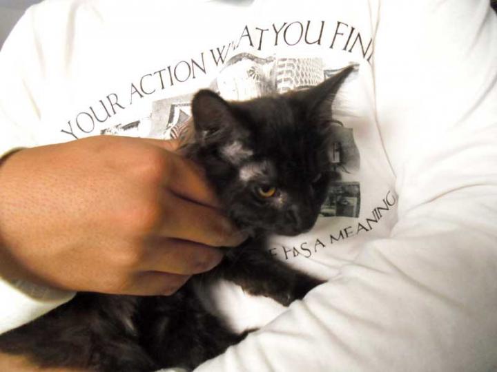 【大人しく、オッサンに、子猫だけどオッサンのような猫が抱かれてます】