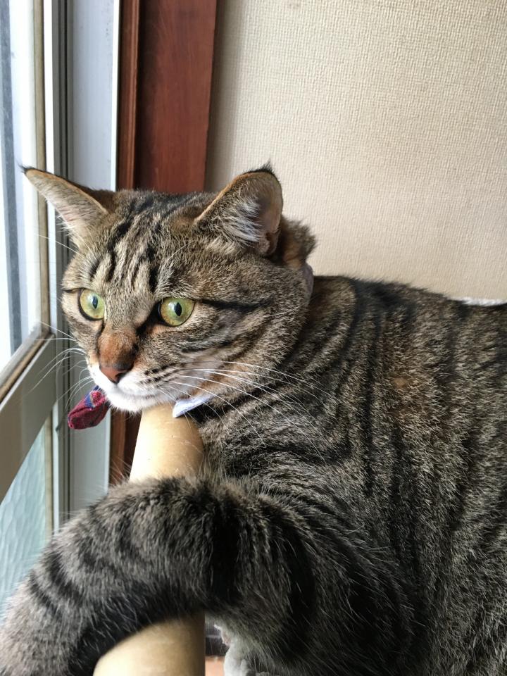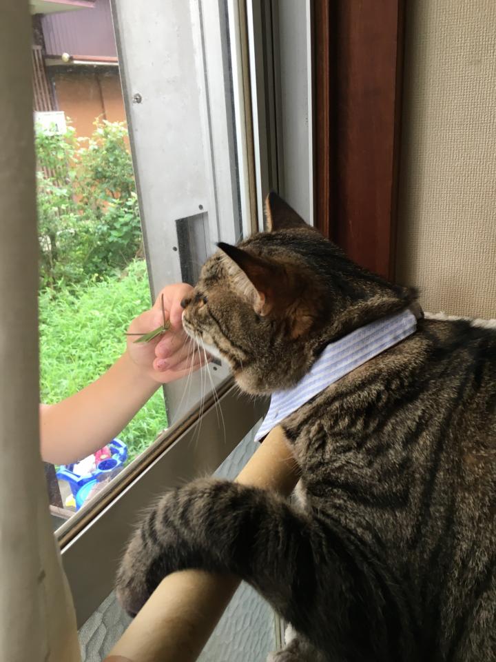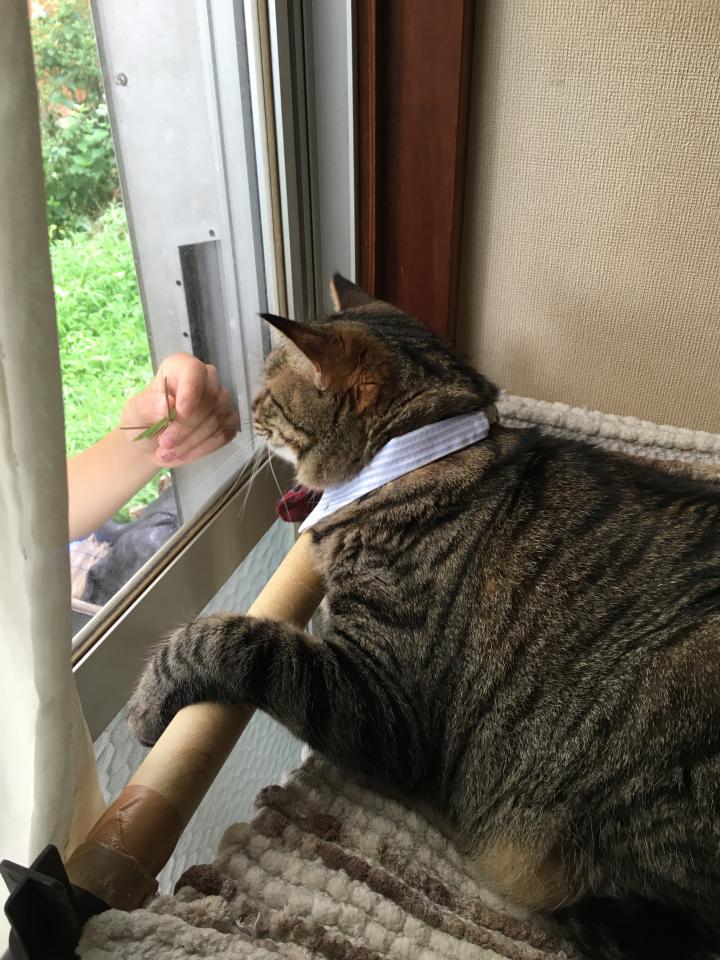 この後、バッタは庭にお帰り頂き、息子も窓から離れたんですが、そうしたらこの残念そうな顔(´・ω・)