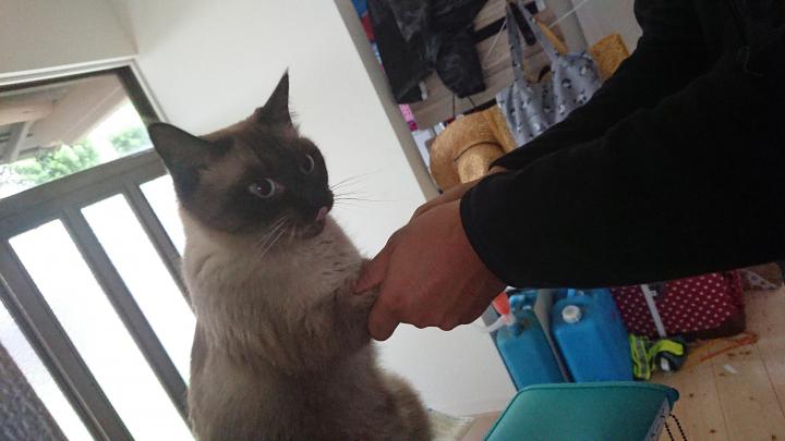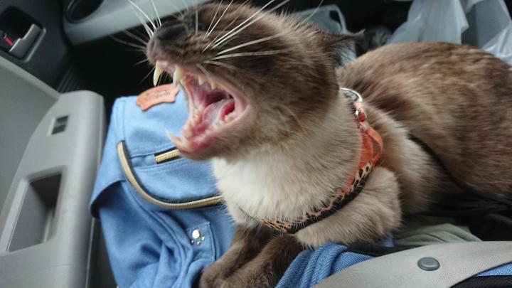 相方が手を放しても、体事体当たり、二足立ちはては、玄関で腹を見せてごろんごろんを見せられ、絆された相方が車内に猫トイレと共に出発。