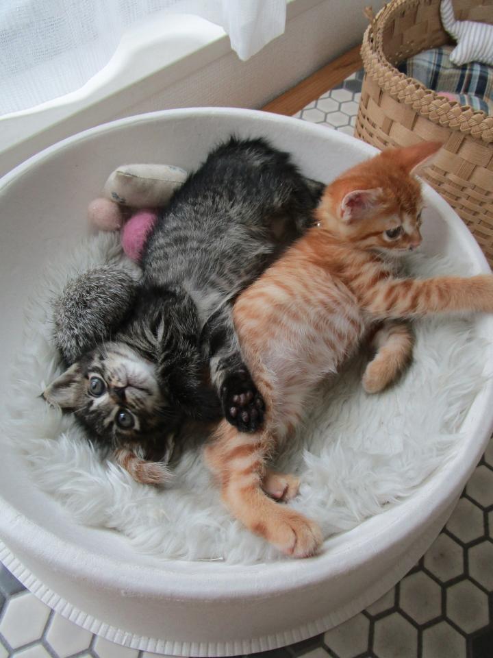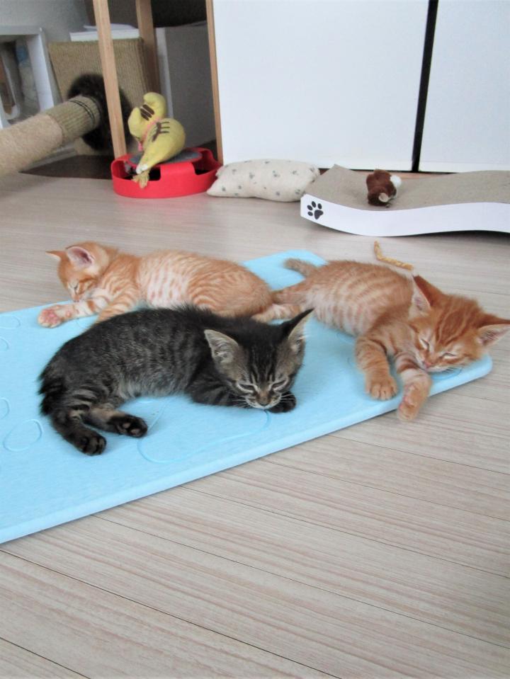 ゴハン後、自然に珪藻土マットに集まって眠るとらーず。