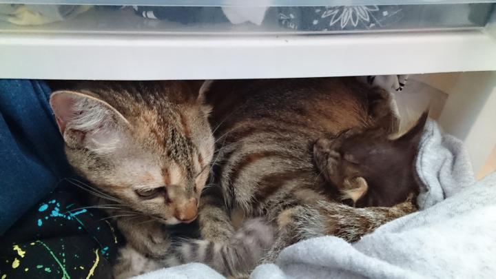 ん……??先住猫のリリちゃんがのそのそと長男の衣装ケースへ……
