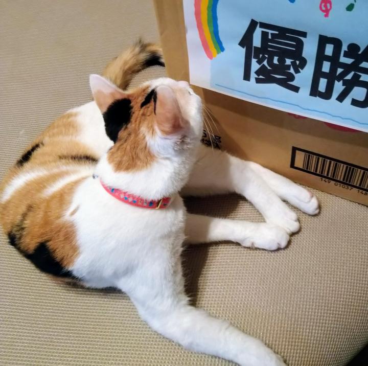 お兄ちゃんの優勝商品に興味津々。でも、欲しいのは中身じゃなくて外身😼