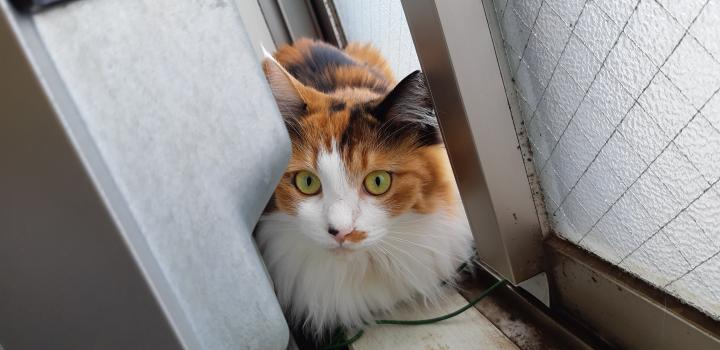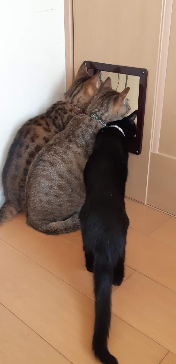 業者さんが我が家に入ってきた直後、この日は開けられなかった猫ドアから外の様子を伺うドラニコポンちゃん😄