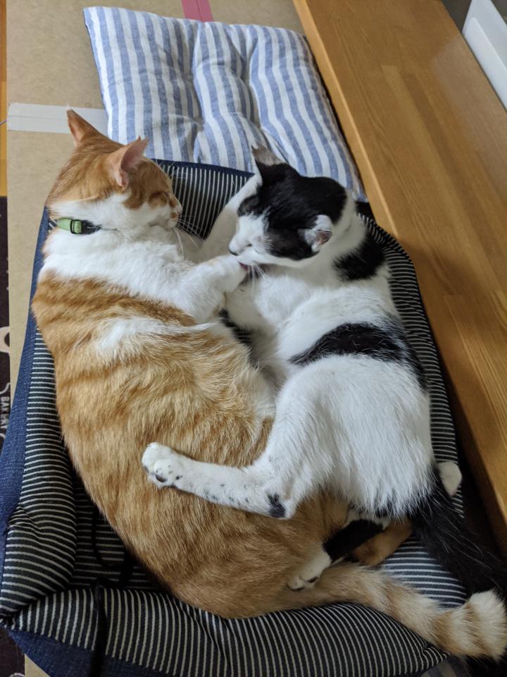 キッツから労いのグルーミングをされて気持ち良さそうなナッツです(*´ω`*)