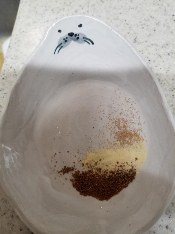 3種を皿に出し、水を2~3滴落として練ってまとめ、適当な大きさに分けると…