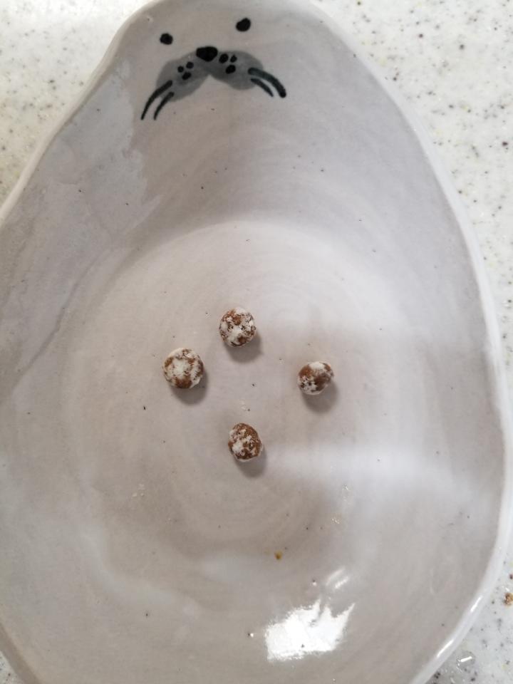 普通の錠剤みたくなります。このままでは苦かろうと、山羊ミルクを少しだけまぶしております。