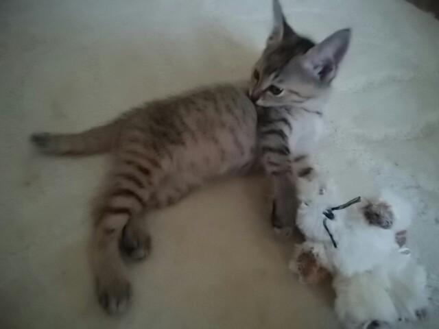 鈴ボールを転がしたり、割りばしやぬいぐるみを噛んだり、転がしたり、段ボール爪とぎで爪を研いだり、