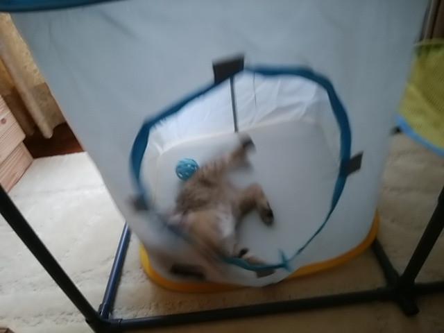 ボックスの中で鈴のボールを転がして激しく遊んでいます。