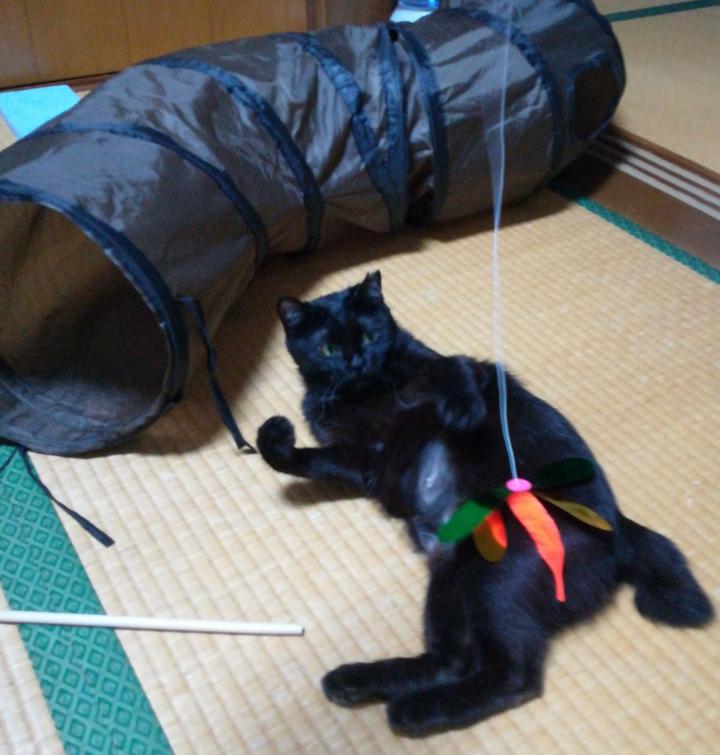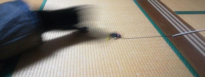 クロちゃんの上から垂らして、私が虫のように振り回すわけですが、クロちゃんのノリが悪い…