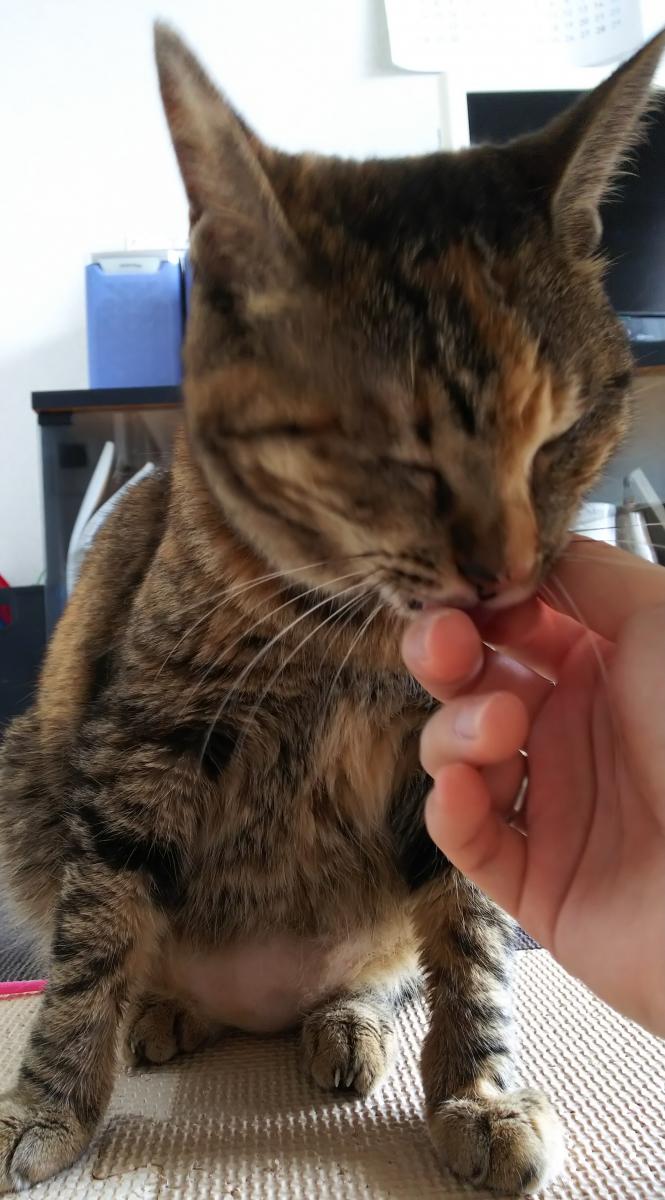 私の顔をじっと見つめてくるところ、可愛い。みゃーん、ていう鳴き声、可愛い。私がそばを通ったら、チョイって前足でタッチしてきて、可愛い。お気に入りのオモチャをくわえて、私のところに持ってくるのも、可愛い。