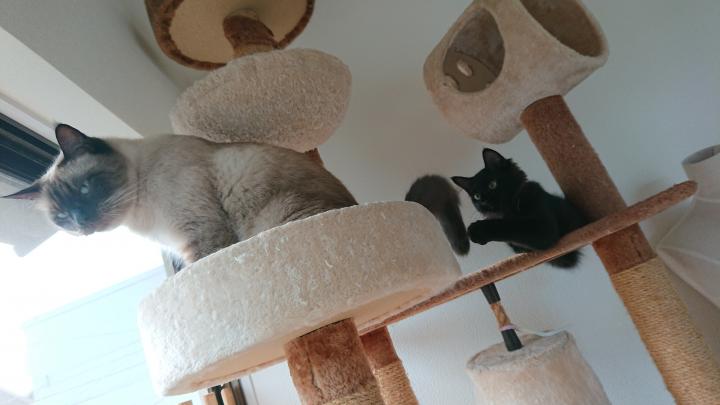 大福に怒られて逃げた高虎と腹見せて寝る体制の虎徹。