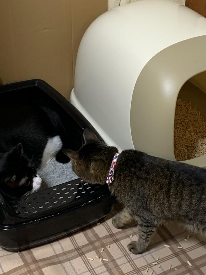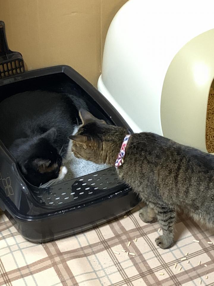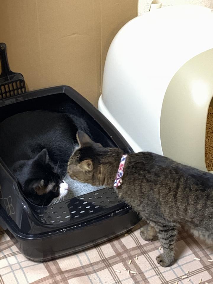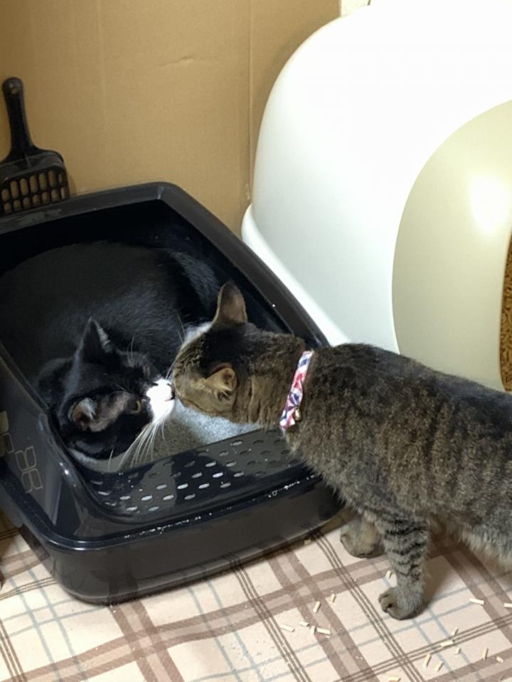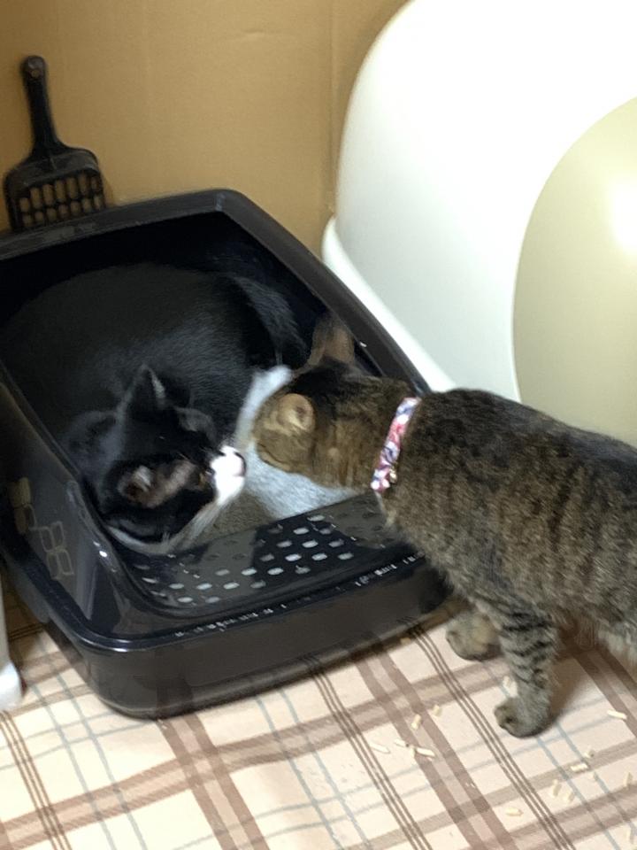 レンくんがなぜかしらトイレでくつろいでるとこをノンちゃんが見に来て、ゆっくり近付き鼻チョン❤