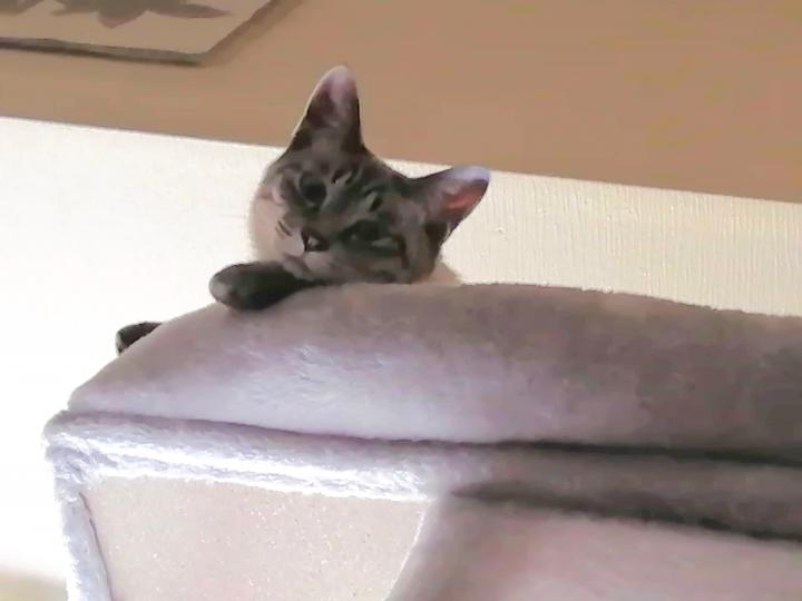 どうやら、小窓付近からカーテンに移動していて 暑すぎて動かなかったようで。