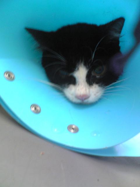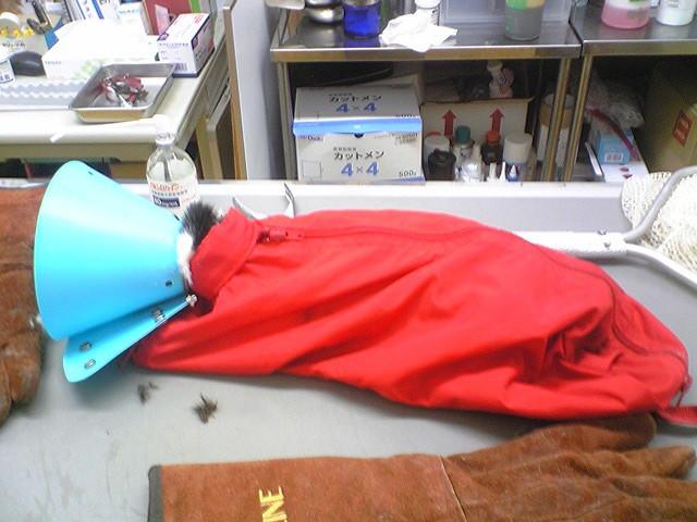 とにかく裂けた皮膚を縫合したい先生は、モモにエリザベスカラーと拘束着を着せ