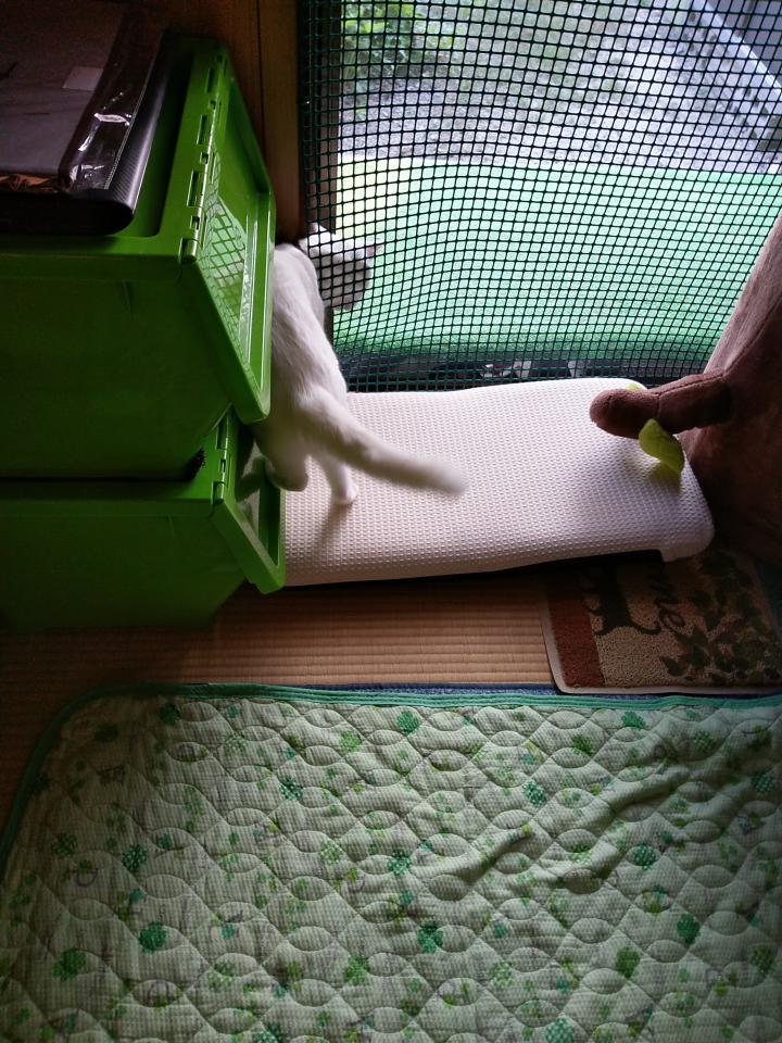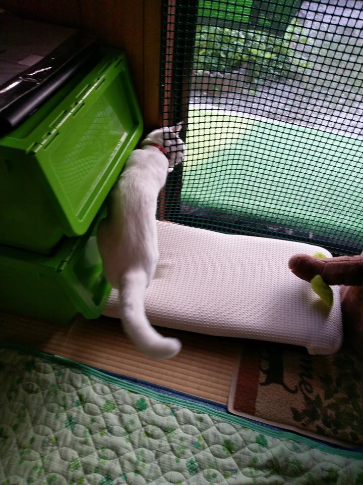 餅子嬢はこうして脱走防止ネットと網戸の隙間に入る
