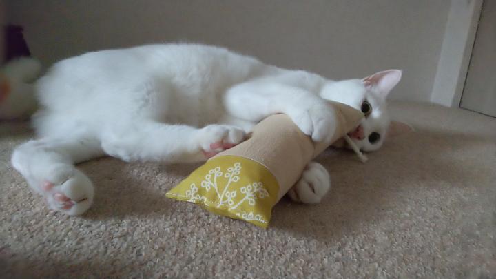 一千花さんからいただきました!ケリぐるみ(^^)ちょっと前ですが。ちーちゃん、寝起きに遊んでます。枕?