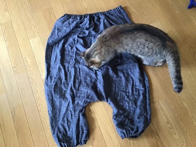 ご主人:こないだたぬきねこと取り合いをした布で作ったサルエルパンツできたど〜!