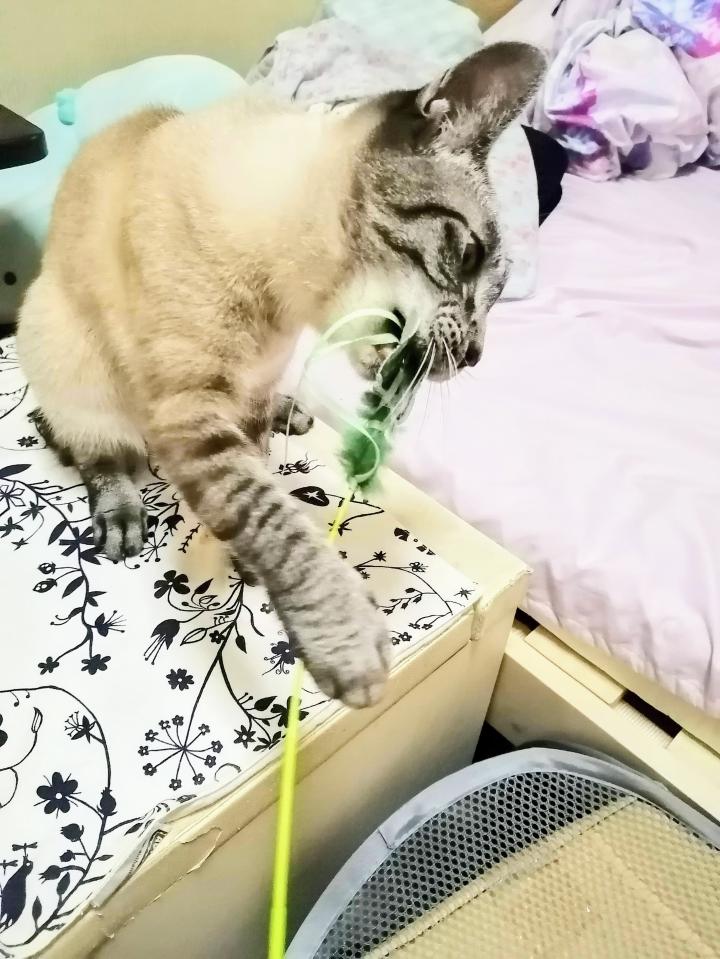 今まで猫じゃらしをゲットした後は、餌とトイレの近くが
