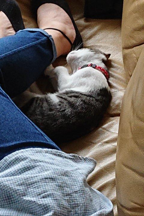 嬶の足元で眠っているリンちゃんです。