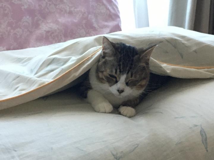 暑いけど、お布団には潜り込んでしまうにゃ