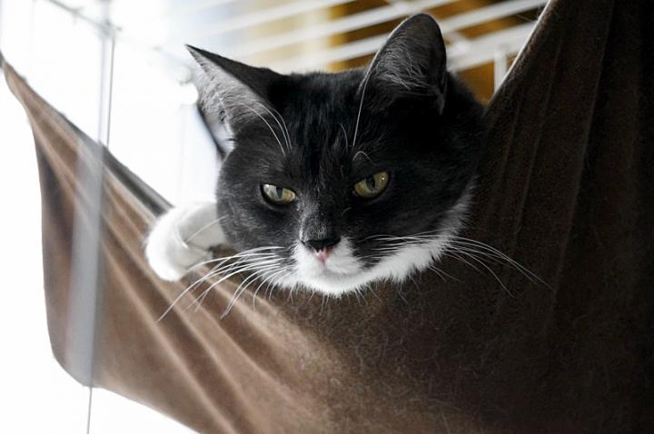空のハンモックは、クーラーの風が一番よく当たる場所なので、動いている時はそれはもう気持ち良さそうにしていますよ。