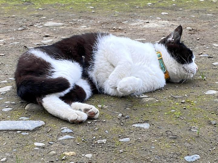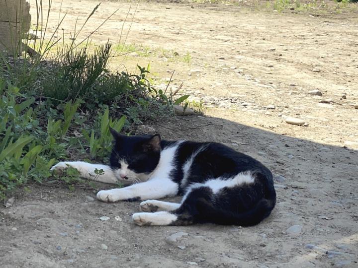 チョビは暑いので、家の影とか物置や倉庫の陰で寝ています。