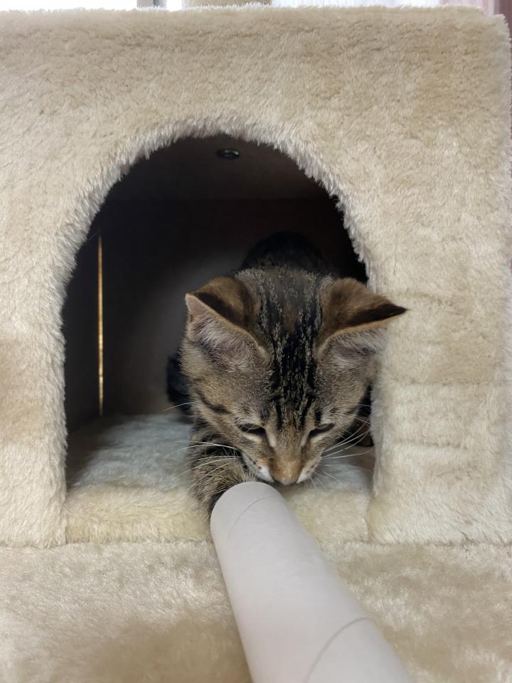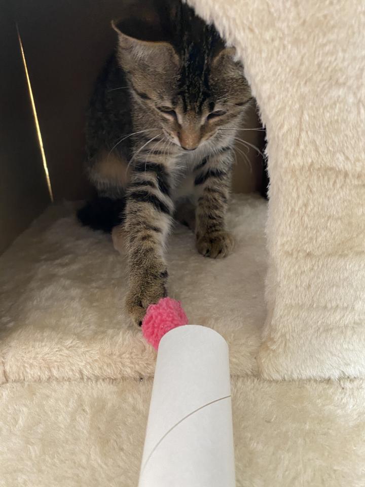 サランラップの筒から猫じゃらしを出したり隠したりして見せると夢中で捕まえようとします。
