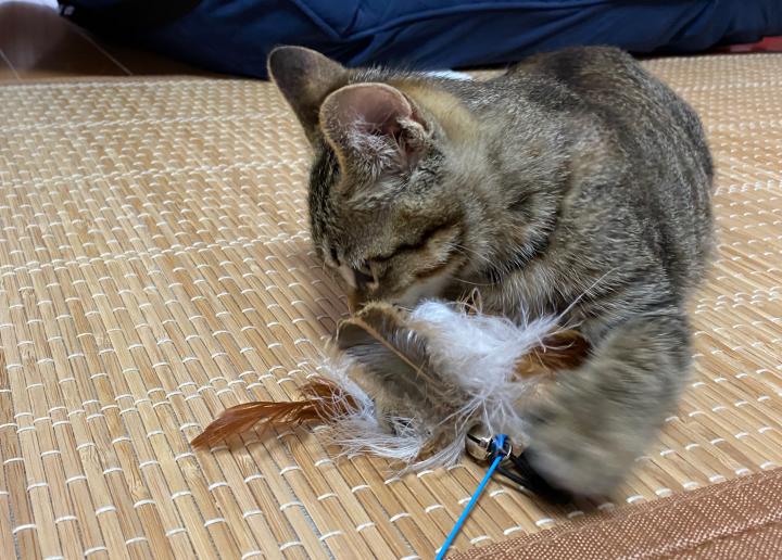 ホンモノの猫じゃらしで遊ぶときのようなの食いつきで、いつも大興奮で遊んでいます。100円とは思えない仕事をしてくれています。