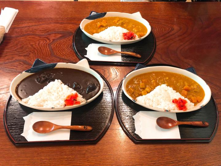 カフェでカレーを注文して、ハチワレが3匹。私と末っ子のは甘口で茶白ちゃんやね。