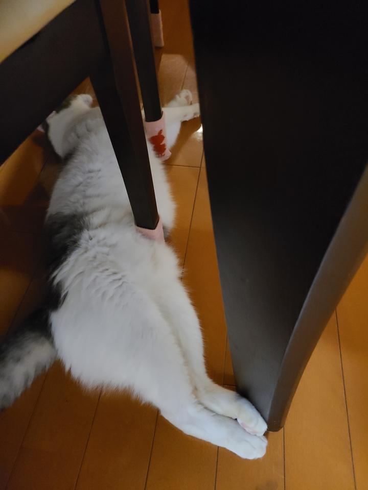最近テーブル下がお気に入りだけど必ず椅子の足に体を絡めるガビさん
