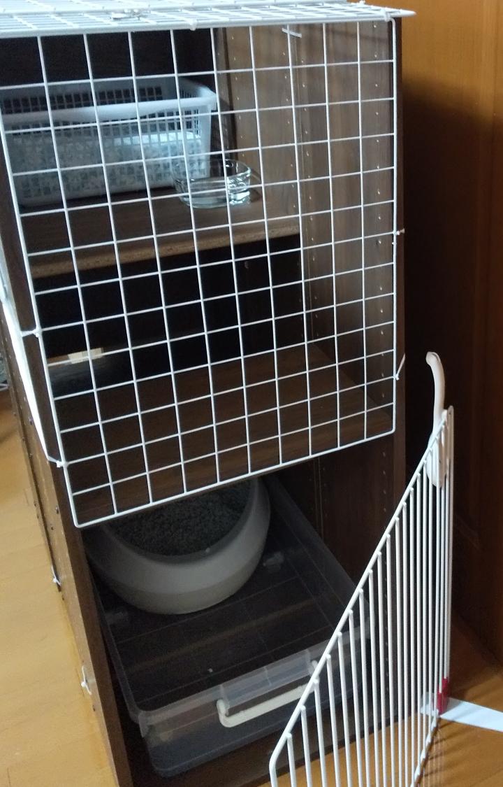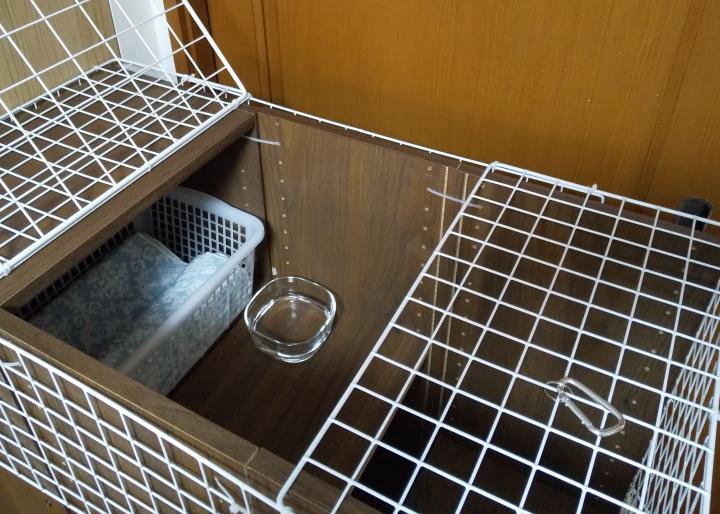 むーくんの落ち着ける居場所としてリビングに仮設ケージ作りました。