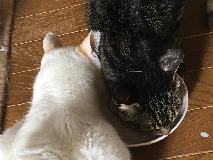 今では毎日の習慣になり、同じように高齢で口の中が痛いシロさんと一緒にミルクを飲んでいます。