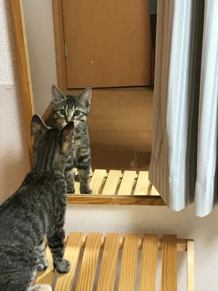 鏡に映る自分にちょいちょいしたり、くんくんしたり興味津々でした