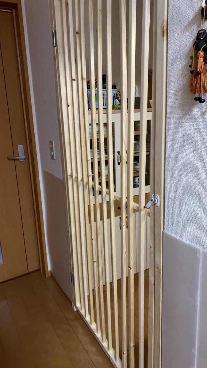 はなの行動範囲も広がってきたため、キッチンに入らないようにホームセンターで買ってきた木で主人が作ってくれました。柵の空間を5センチ幅にしたところ、頭は通り抜けるのですが、骨盤で引っかかり、潜ろうとしていたはなも途中で諦めていました。はながサイズダウンすることはないので、ギリギリセーフのサイズでした。同じものを玄関にも付けて脱走対策も完了♪