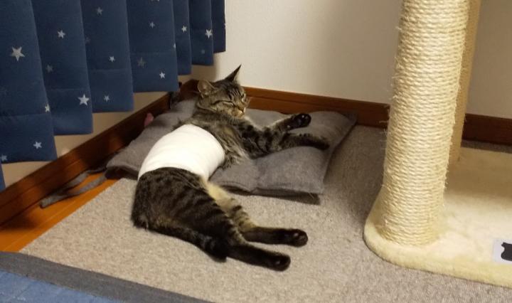 病院の先生から、包帯は子猫がじゃれついた位でゆるまないし術後も元気だから大丈夫、と聞き、