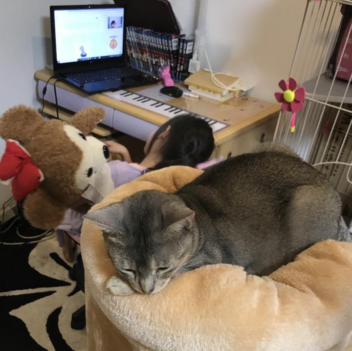 娘は今週終業式で早帰り❣️ビビと一緒にオンライン英会話中😸