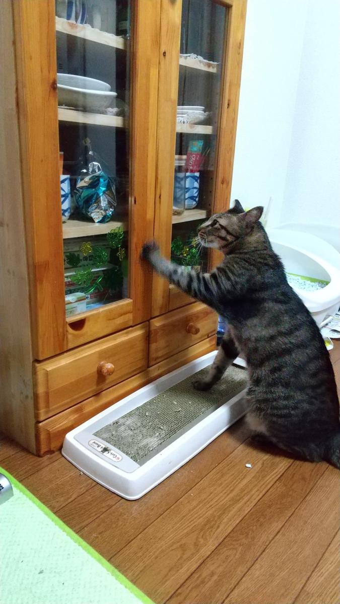 中にはササミパウチやちゅーるやらまたたびやらが入ってるので何が欲しいのか分からず、とりあえず扉を開け放ちます