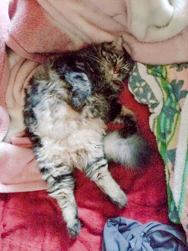 涼しくなってきたとはいえ、毛布の上で寝るのは暑い様子のきなこ…