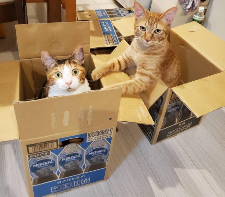 お姉さんと弟みたいに、二匹共仲良く、箱を見ると中に入り、並べて置くと、モグラ叩きして遊んでます😊