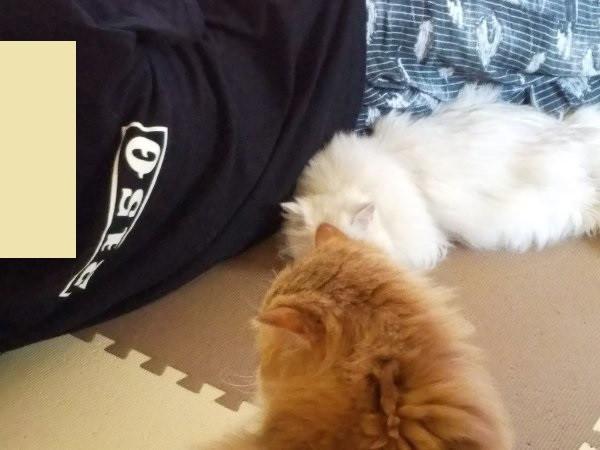 遊び疲れて横になる綾野GOに寄り添い、ピーピー鳴いて訴える。