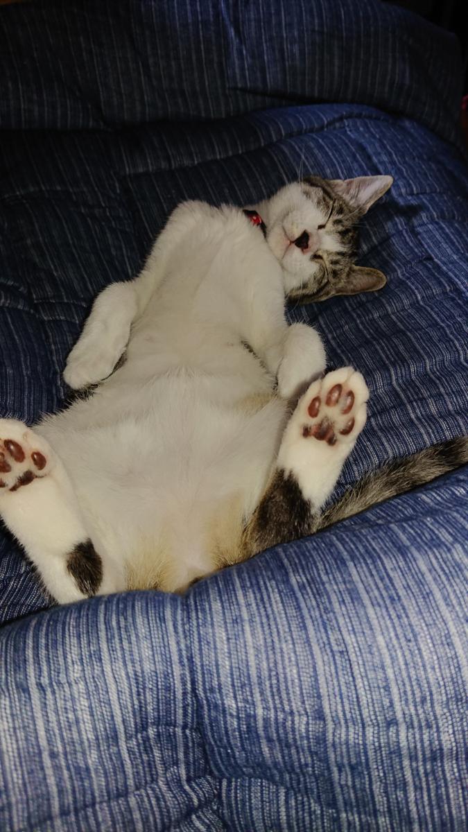 夕べのこと。リンちゃんは朝から暴れっぱなしで疲れたようだ。静かになったのでふと横を見るとそこにはおっさんになってしまったリンちゃんの姿が・・・これでは嬶と同じではないか。ミツジロウはんは思った。