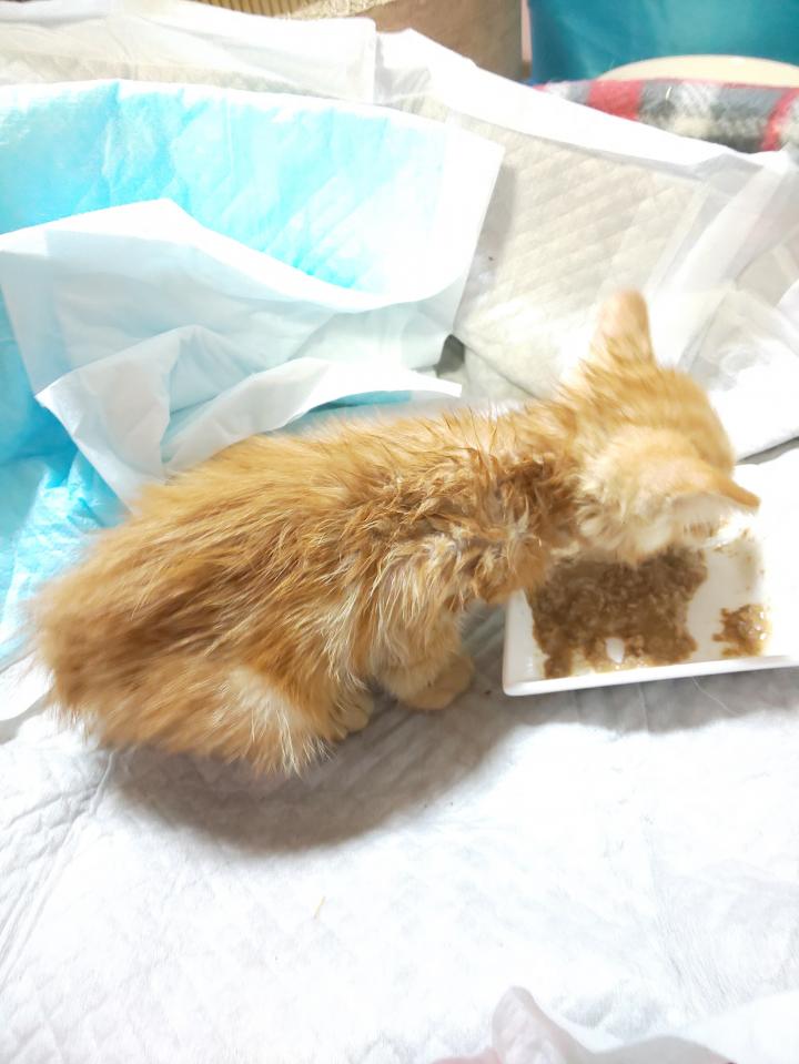 帰宅して風邪薬入りのウエットフードを食べる茶トラ
