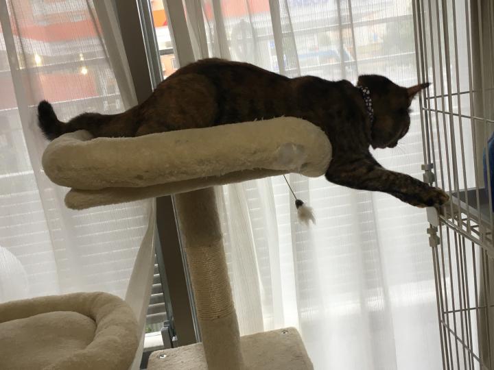 トイレとケージの掃除のため、ちょっとケージの位置をずらしていたら、不安定な格好でチョイチョイしてる。