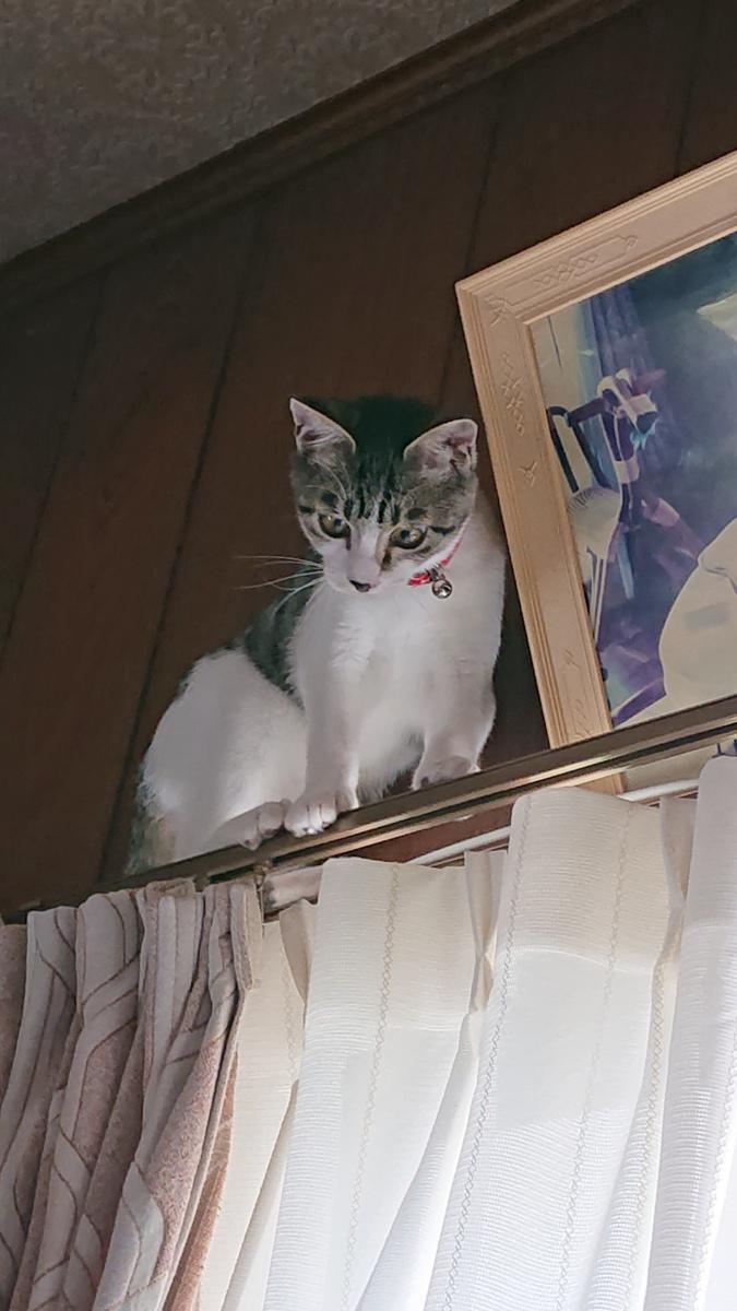 カーテンレールのうえを移動するリンちゃんです。