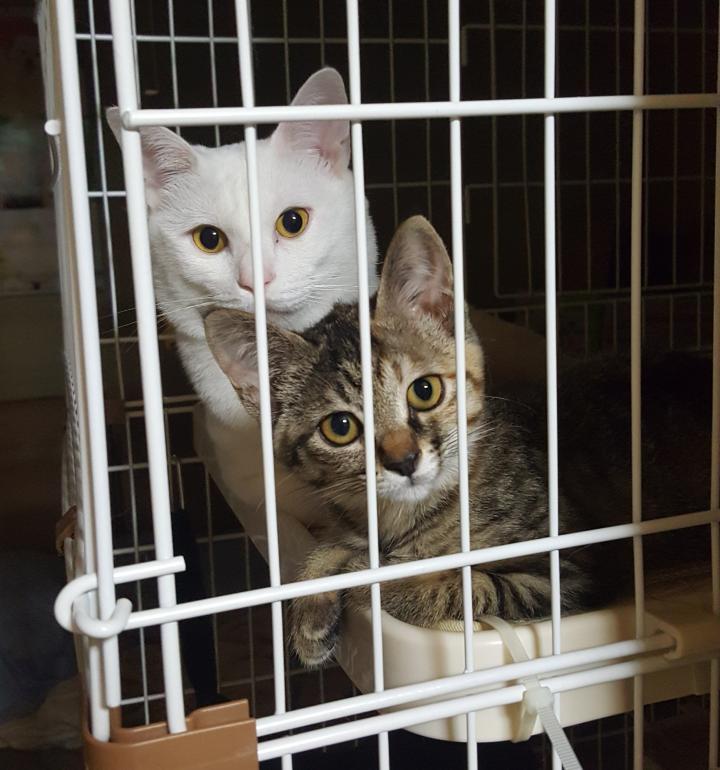 私が朝出かける前は2匹そろっていつも↑の顔(笑) 「何してるの?」と話してそうです(^o^;)